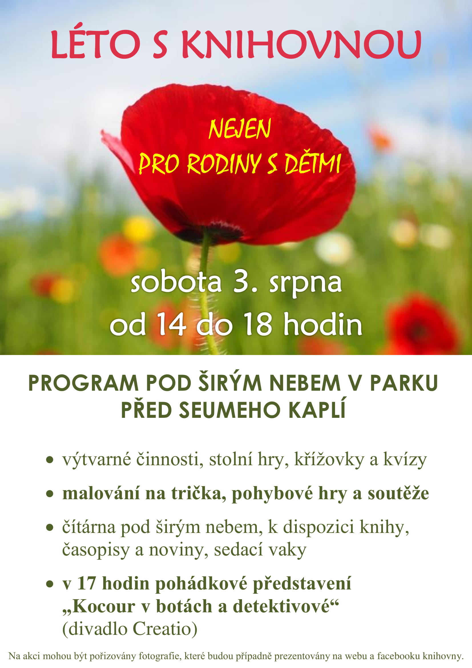 ZA NEPŘÍZNIVÉHO POČASÍ se přesuneme do společenského sálu v budově knihovny. I tam můžeme soutěžit, hrát si a nenechat si deštěm odpoledne zkazit.