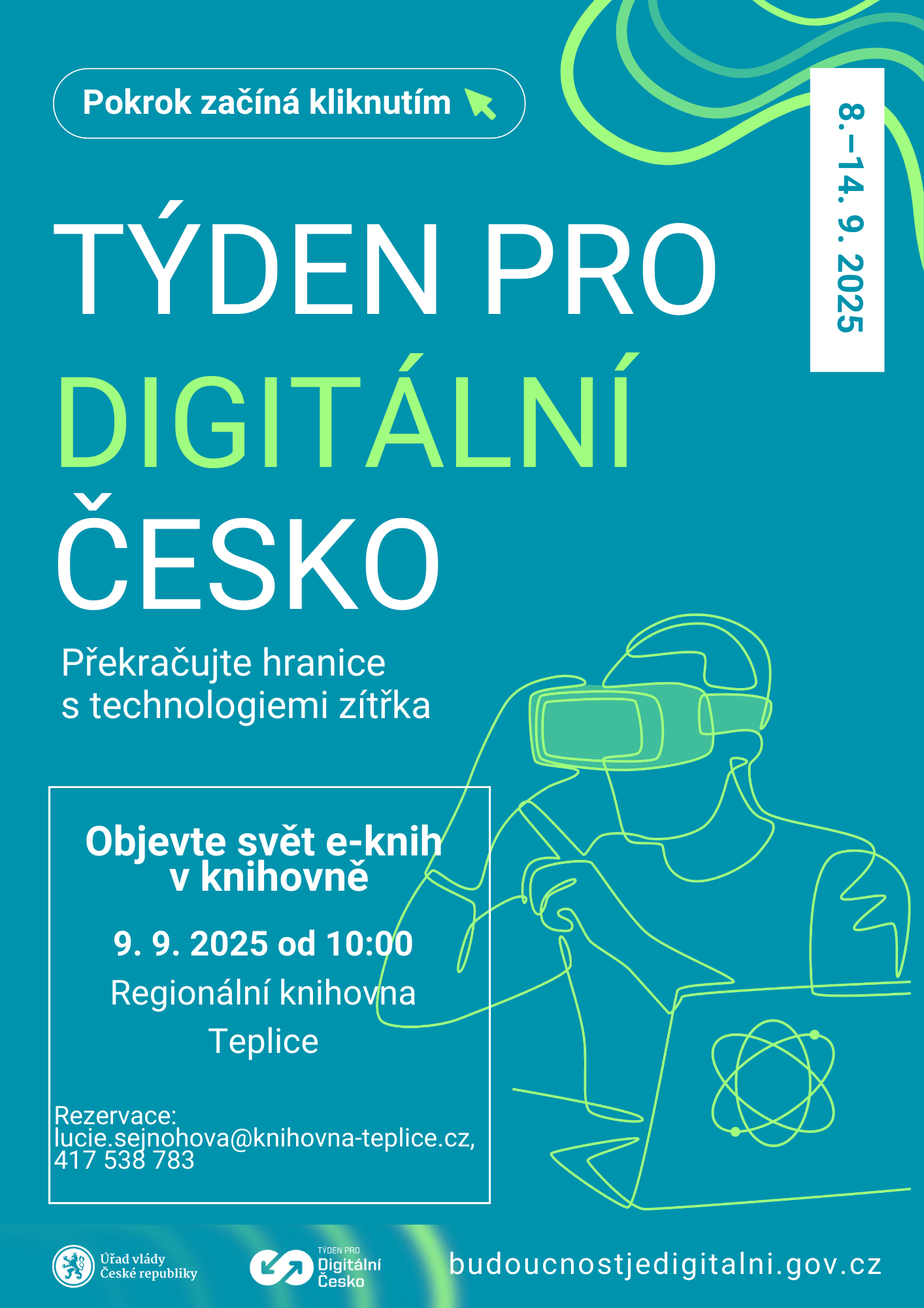 Kurz v rámci projektu Týden pro Digitální Česko. Dozvíte se, jak pracovat s e-knihami, na jakých zařízeních je číst, a vyzkoušíte aplikaci Palmknihy.cz. Rezervace: lucie.sejnohova@knihovna-teplice.cz, 417 538 783.