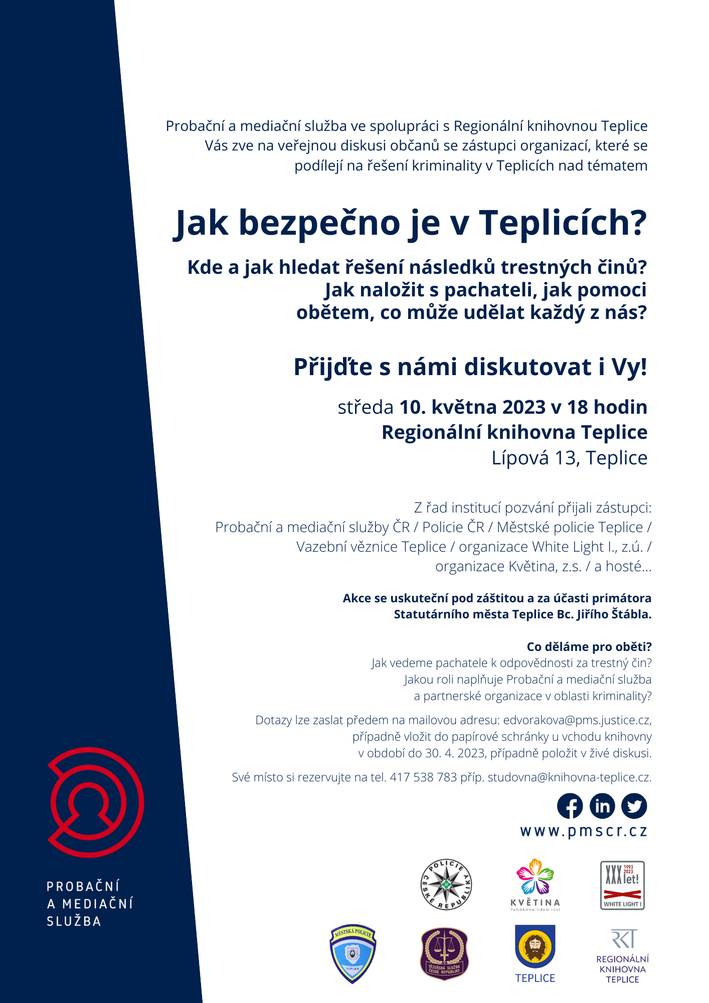 Probační a mediační služba ve spolupráci s Regionální knihovnou Teplice Vás zve na veřejnou diskusi občanů se zástupci organizací, které se podílejí na řešení kriminality v Teplicích nad tématem "Jak bezpečno je v Teplicích?"