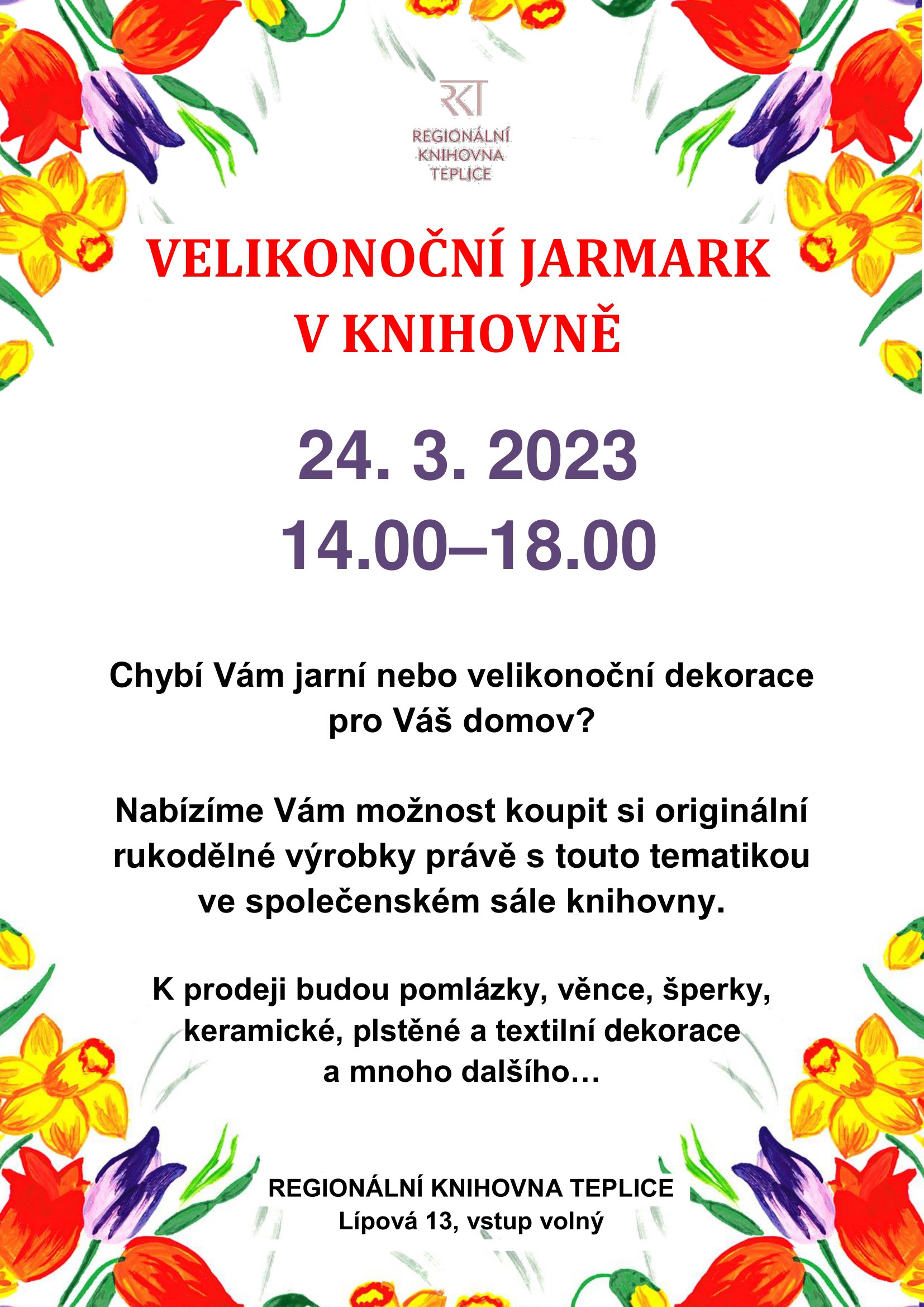 Nabízíme Vám možnost koupit si originální rukodělné výrobky právě s touto tematikou ve společenském sále knihovny. K prodeji budou pomlázky, věnce, šperky, keramické, plstěné nebo textilní dekorace a mnoho dalšího…