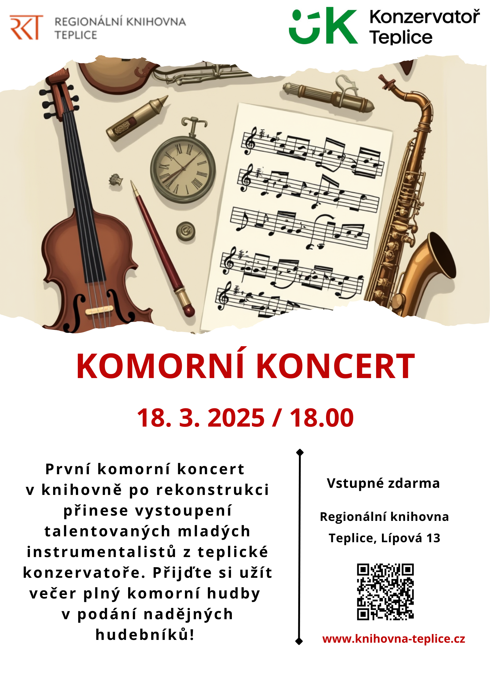 První komorní koncert v knihovně po rekonstrukci přinese vystoupení talentovaných mladých instrumentalistů z teplické konzervatoře. Přijďte si užít večer plný komorní hudby v podání nadějných hudebníků!