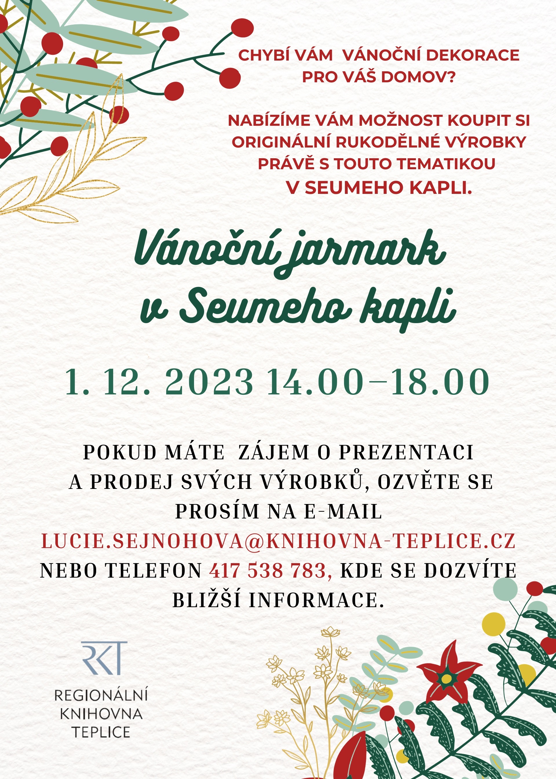 Pokud máte zájem o prezentaci a prodej svých výrobků, bližší informace se dozvíte na e-mailu: lucie.sejnohova@knihovna-teplice.cz nebo tel. 417 538 783.